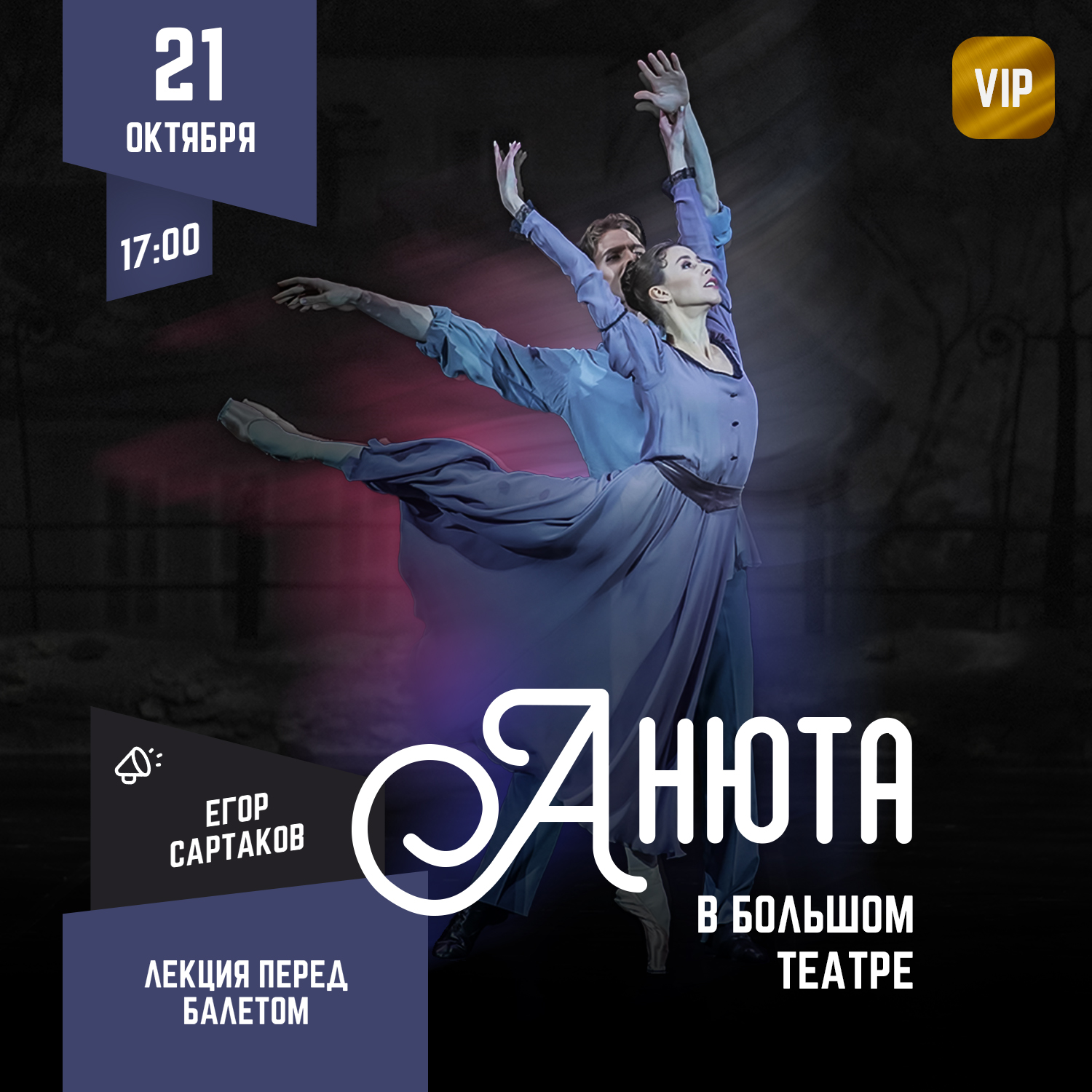 В компании Егора Сартакова отправимся на балет «Анюта» в Большой театр, предварительно подготовившись к нему с помощью лекции о рассказе А. П. Чехова «Анна на шее». Монотонная повседневность жизни маленького провинциального городка, запечатлённого в чеховском рассказе, мастерски передана в пластических образах, вобравших в себя множество эпизодических персонажей, наделённых характерными чертами и отмеченных яркой актёрской индивидуальностью.