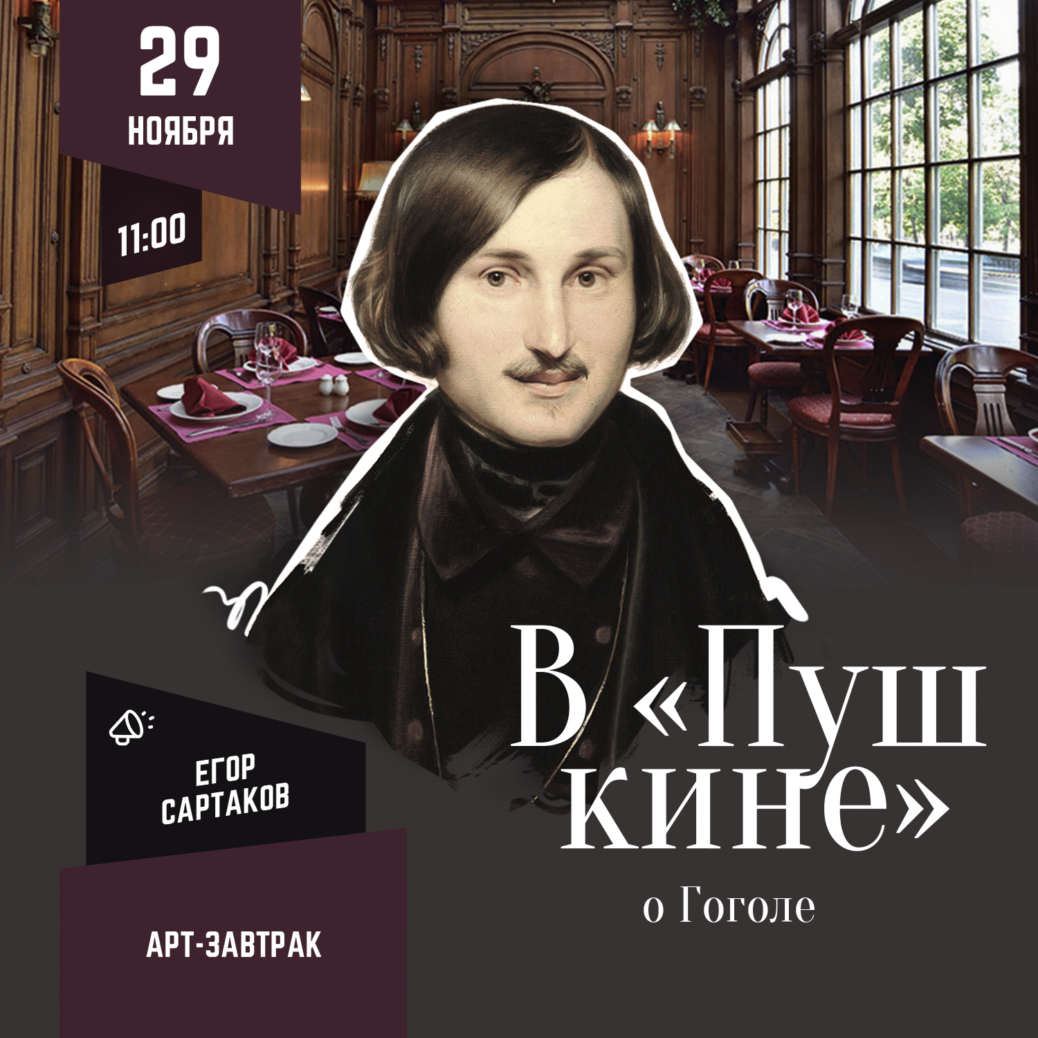 Под игристое и легкий завтрак мы услышим рассказ о жизни Гоголя сразу в трех местах – на Украине, в России и в Италии. Узнаем, почему брак родителей Гоголя благословила сама Богородица и как фанатичная религиозность матери повлияла на маленького Николая и его творчество. Ответим на вопрос, почему Гоголь перебрался из теплой Малороссии в неуютный, чужой ему Петербург и из чего была сшита его шинель в этом холодном городе.