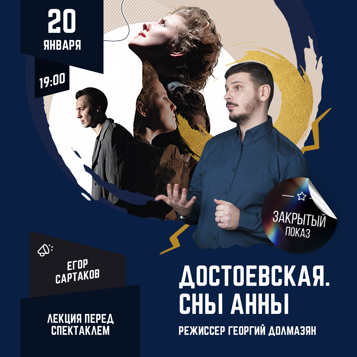 А после этого мы погрузимся в спектакль «Достоевская. Сны Анны». История любви длиною в жизнь, любви после жизни – за пределами времени и пространства – история, ставшая основой нового спектакля в театре МОСТ «Достоевская. Сны Анны» режиссера Георгия Долмазяна.