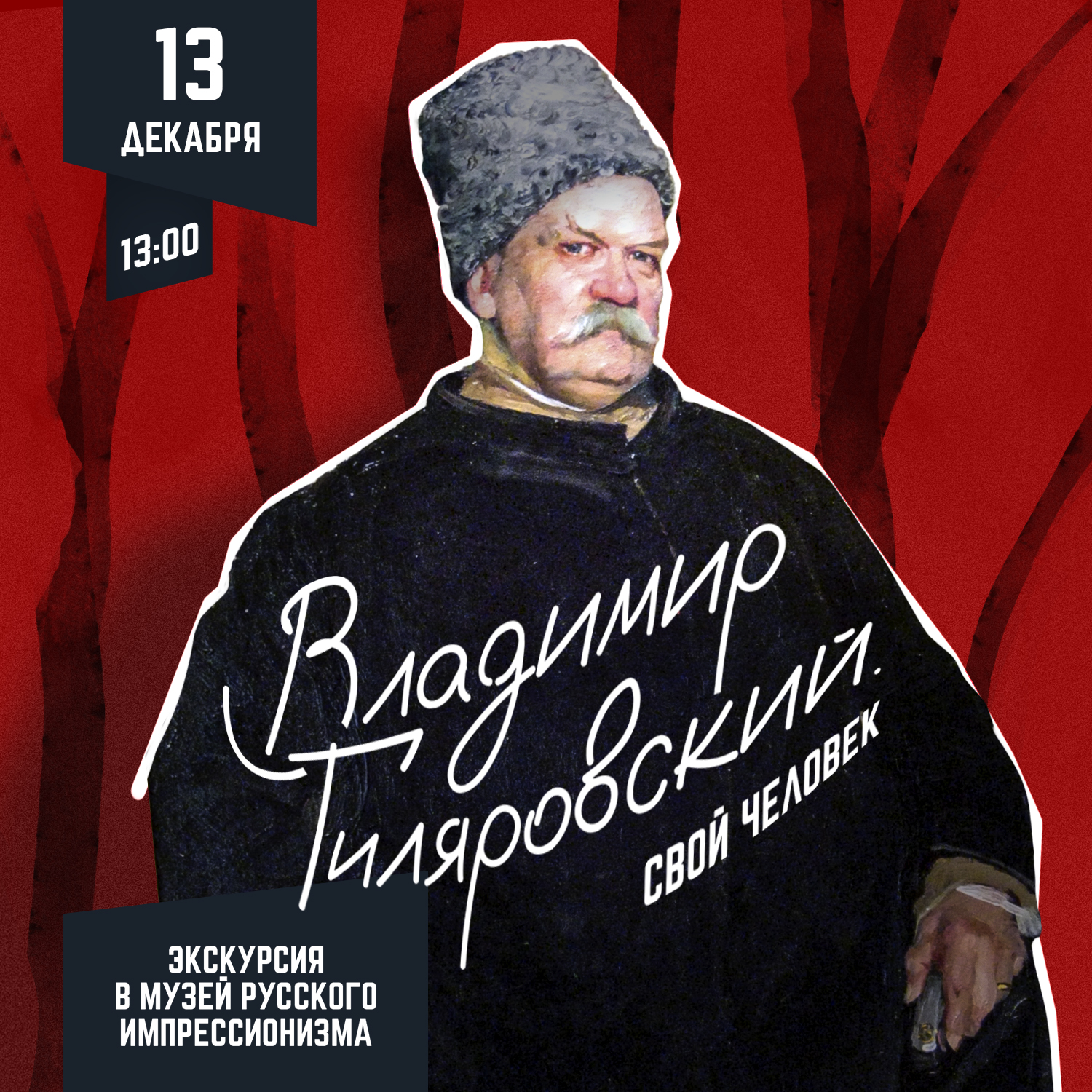 Музей русского импрессионизма приглашает в путешествие по Москве с «королем репортеров» Владимиром Гиляровским. От провинциального купеческого города 1880-х до динамично развивающейся столицы 1930-х — такой ее видел журналист и писатель, такой ее увидят и посетители выставки «Свой человек. Владимир Гиляровский» на работах Ильи Репина и Василия Кандинского, Константина Коровина и Наталии Гончаровой и других живописцев и графиков. Художественную часть выставки в Музее русского импрессионизма дополнят свидетели эпохи научно-технического прогресса — предметы из фондов Политехнического музея, выступившего соорганизатором проекта.