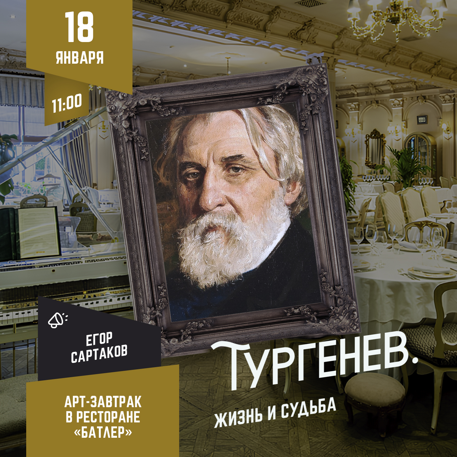 Приглашаем вас на арт-завтрак в компании Егора Сартакова. Под игристое и легкий завтрак мы услышим рассказ о жизни Ивана Тургенева. Его по праву можно назвать «русским европейцем». Убежденный западник, подолгу живший в Европе, именно из Франции он призывал любить «великий, могучий, правдивый и свободный» русский язык.