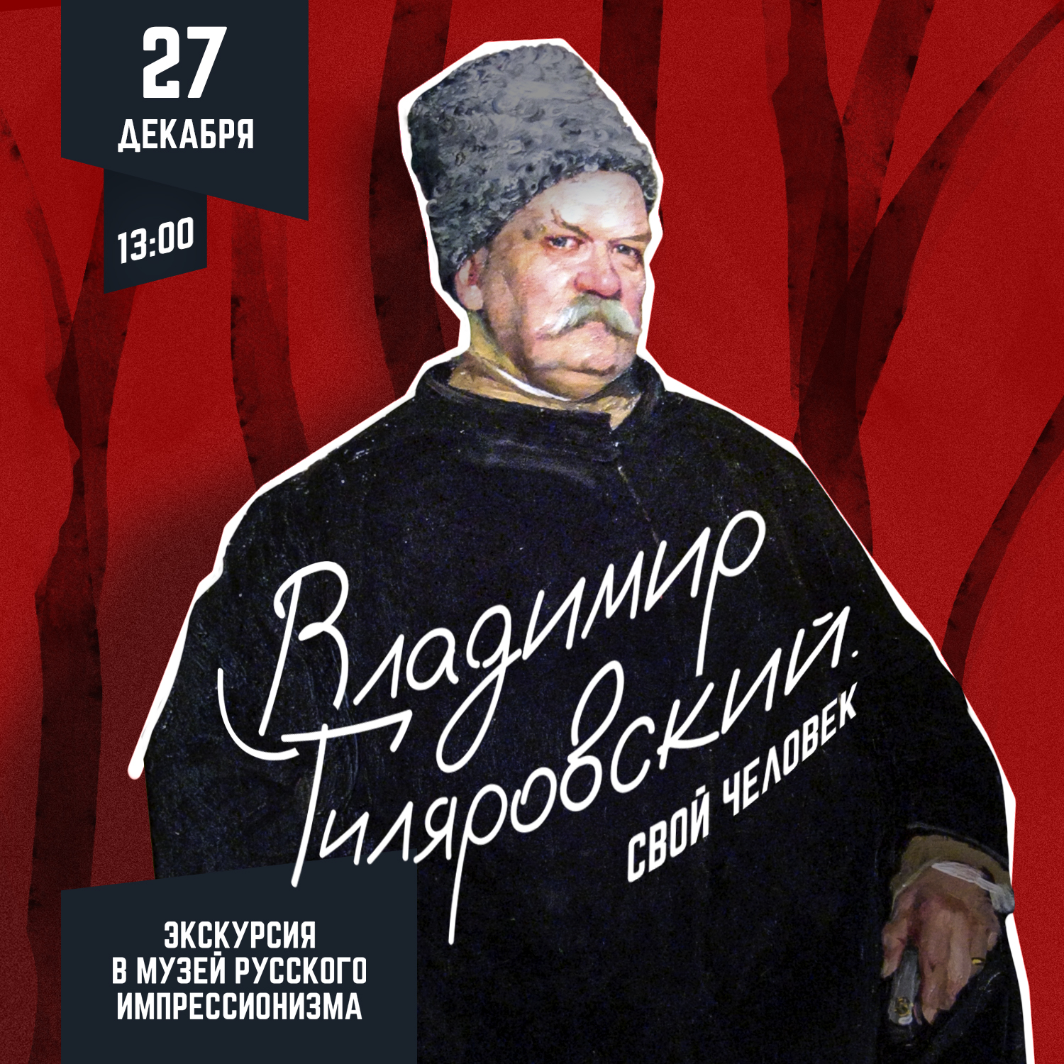 Музей русского импрессионизма приглашает в путешествие по Москве с «королем репортеров» Владимиром Гиляровским. От провинциального купеческого города 1880-х до динамично развивающейся столицы 1930-х — такой ее видел журналист и писатель, такой ее увидят и посетители выставки «Свой человек. Владимир Гиляровский» на работах Ильи Репина и Василия Кандинского, Константина Коровина и Наталии Гончаровой и других живописцев и графиков. Художественную часть выставки в Музее русского импрессионизма дополнят свидетели эпохи научно-технического прогресса — предметы из фондов Политехнического музея, выступившего соорганизатором проекта.