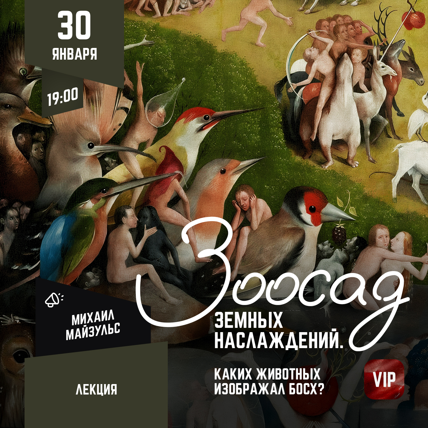 В Средние века земной рай мыслили как пространство идиллии, гармонии между человеком и животными. Все изменилось только с грехопадением Адама и Евы, когда в мир вошла смерть, люди оделись в шкуры зверей, а позже начали есть их мясо. «Сад земных наслаждений» – самый необычный и трудный для интерпретации из триптихов Иеронима Босха. История, которую он рассказывает, начинается в Эдеме. Но Эдем этот странный. Он не похож даже на другие райские сады, которые писал сам Босх. Один из возможных ключей к его посланию – в его фауне. Почему Босх поселил туда жирафа с единорогом, как туда попали рыба-монах и кот, пожирающий мышь? И, главное, что в иконографии этого триптиха фигуры животных говорят о судьбах людей?