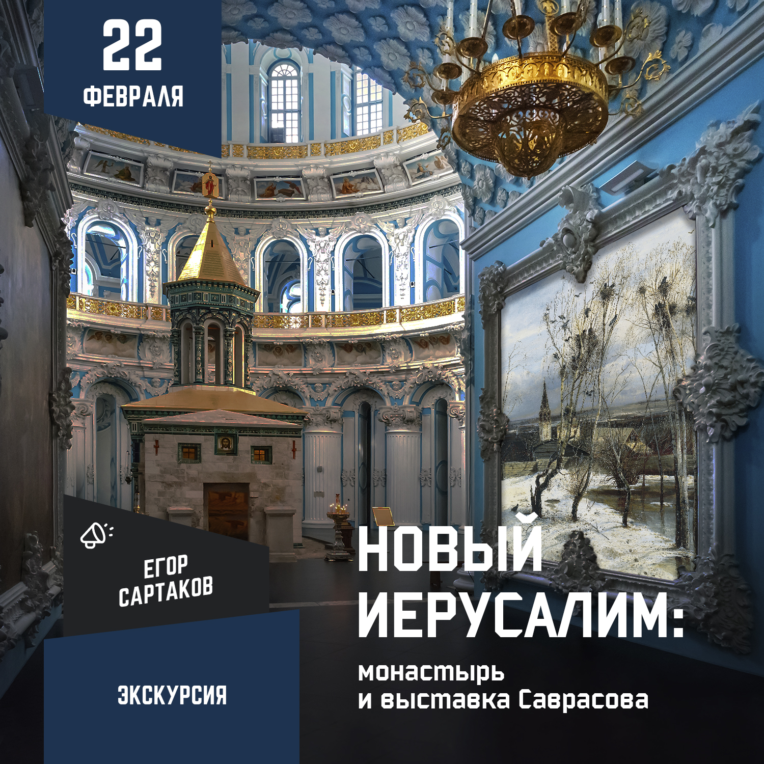 В компании Егора Сартакова отправимся на выставку, по дороге в Новый Иерусалим Егор расскажет о нелегком пути Алексея Саврасова, для которого знаменитые «грачи» стали и шедевром, и проклятием.