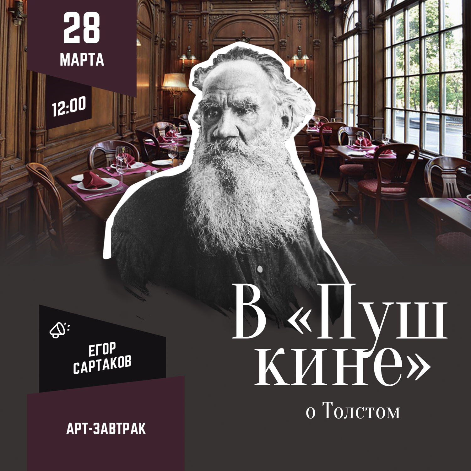 Приглашаем вас на арт-завтрак в компании Егора Сартакова. Под игристое и легкий завтрак мы услышим рассказ о жизни Толстого. Узнаем, почему даже годы жизни этого человека поражают и как можно успеть написать за жизнь 90 томов книг. Обсудим, чем еще кроме литературы занимался Лев Толстой, почему его можно считать гениальным педагогом и что такое «свободная школа для свободных людей».