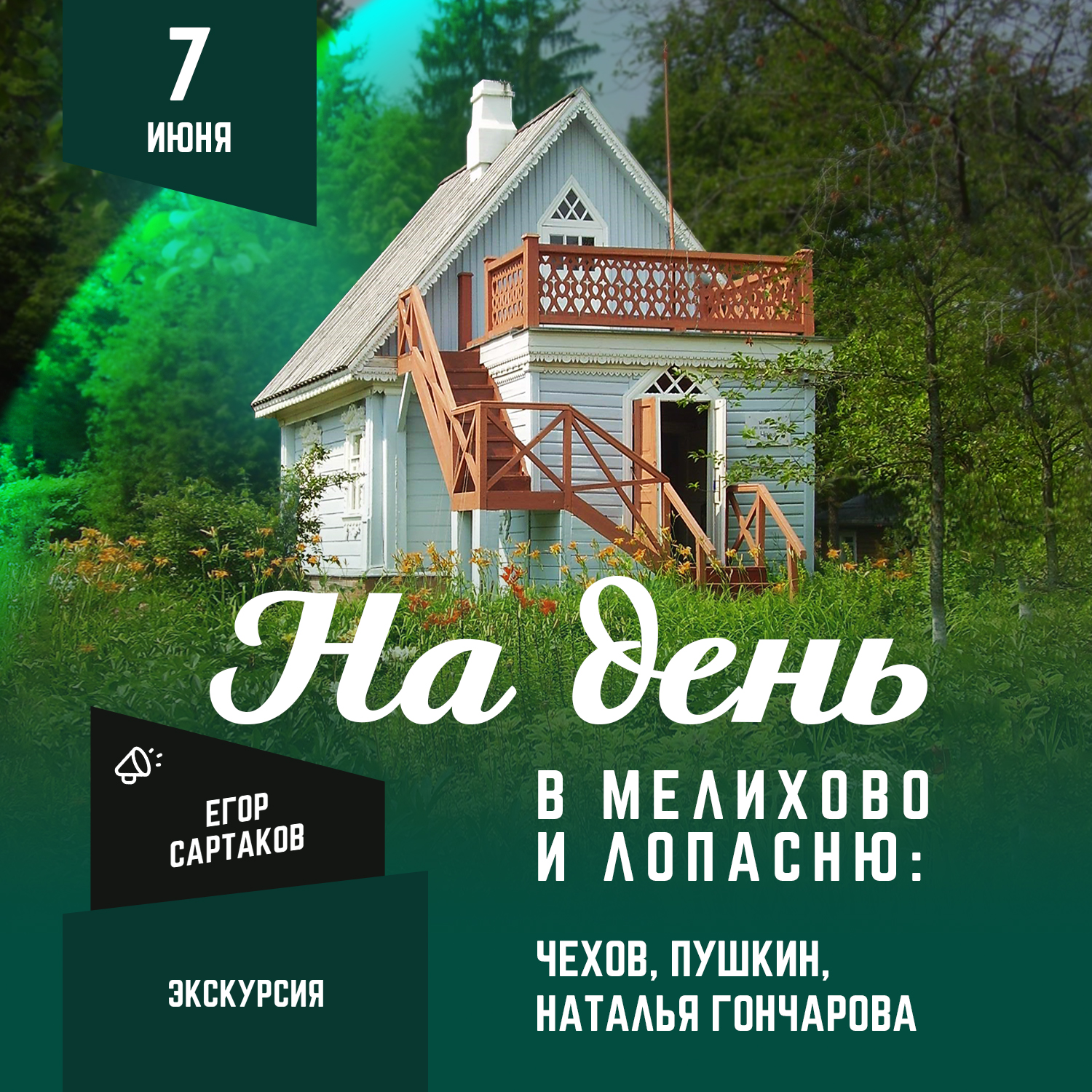 Предлагаем вам в компании с доцентом МГУ Егором Сартаковым отправиться на экскурсию в писательскую усадьбу Мелихово. Мы осмотрим дом, в котором жил писатель, флигель-кухню, где представлен деревенский русский быт, конца 19 – начала 20-х веков. Врачебную деятельность Чехова обсудим в «Амбулатории» писателя, а о его личных драмах поговорим на «Аллее Любви».