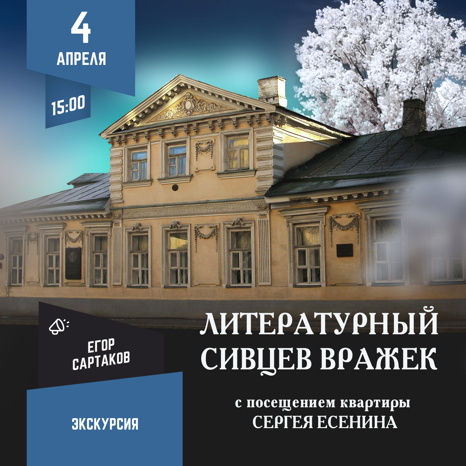 А после этого у нас будет уникальная возможность посетить квартиру Сергея Есенина на Сивцевом Вражке с экскурсией. Мы побываем в удивительном доме с эркерами, в неоклассическом стиле, который был построен как доходный для Ольги Сергеевны Петровской в 1913 году. До сих пор в доме сохранились резные дубовые двери и фрески по рисункам архитектора Челищева, которые жители отреставрировали в наше время за свой счет. Во дворе этого дома, на первом этаже, в комнате небольшой коммунальной квартиры долгие годы жила Анна Романовна Изряднова – первая гражданская жена Сергея Есенина и мать его первенца Юрия. Именно в этом доме поэта последний раз видели в Москве в декабре 1925 году, когда в квартире Изрядновой он жег рукописи перед отъездом в Ленинград, ставшим для него роковым. Даже печь, в огне которой погибли рукописи Есенина, сохранилась. Дом, обстановку, печь – все это мы увидим на экскурсии.