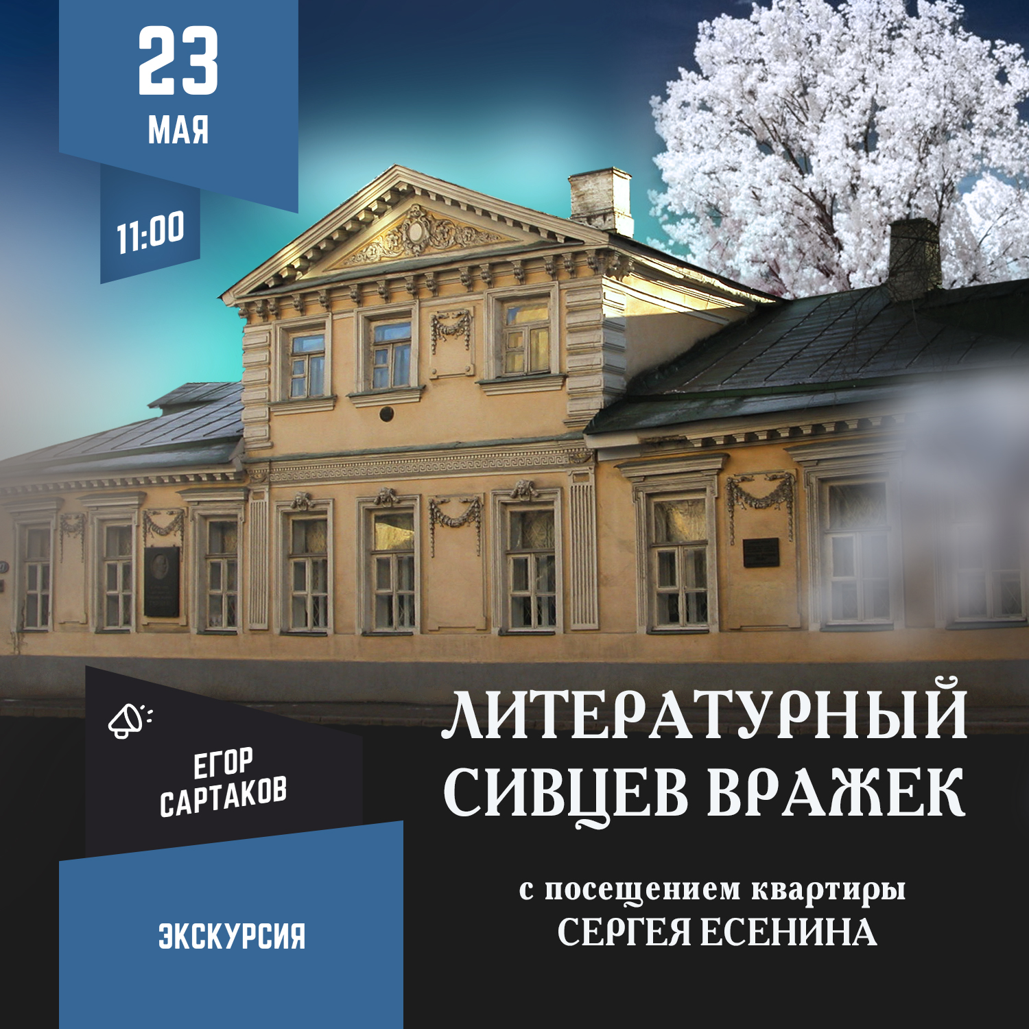 А после этого у нас будет уникальная возможность посетить квартиру Сергея Есенина на Сивцевом Вражке с экскурсией. Мы побываем в удивительном доме с эркерами, в неоклассическом стиле, который был построен как доходный для Ольги Сергеевны Петровской в 1913 году. До сих пор в доме сохранились резные дубовые двери и фрески по рисункам архитектора Челищева, которые жители отреставрировали в наше время за свой счет. Во дворе этого дома, на первом этаже, в комнате небольшой коммунальной квартиры долгие годы жила Анна Романовна Изряднова – первая гражданская жена Сергея Есенина и мать его первенца Юрия. Именно в этом доме поэта последний раз видели в Москве в декабре 1925 году, когда в квартире Изрядновой он жег рукописи перед отъездом в Ленинград, ставшим для него роковым. Даже печь, в огне которой погибли рукописи Есенина, сохранилась. Дом, обстановку, печь – все это мы увидим на экскурсии.